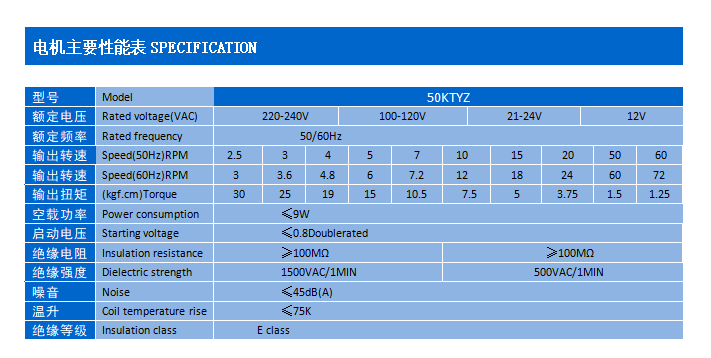 電機主要性能表 SPECIFICATION